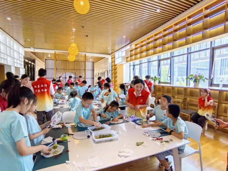 志愿者老师先是耐心细致地向孩子们讲解每一种植物的外貌特征、生长习性及文化寓意,随后现场示范,生动展示了如何将植物的形态与色彩巧妙地拓印到白扇之上,形成一幅幅独一无二的自然画卷。孩子们被这一技艺深深吸引,纷纷跃跃欲试亲手创作属于自己的作品。