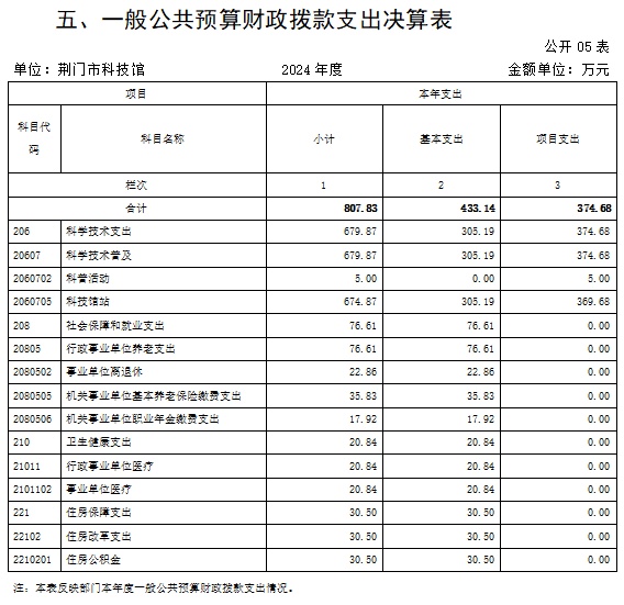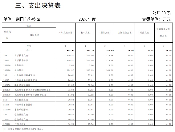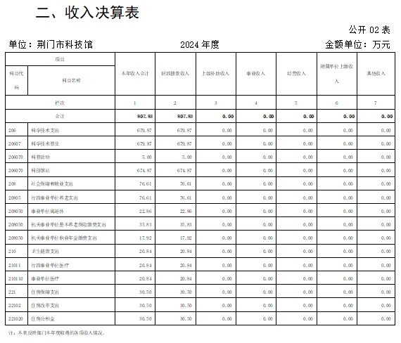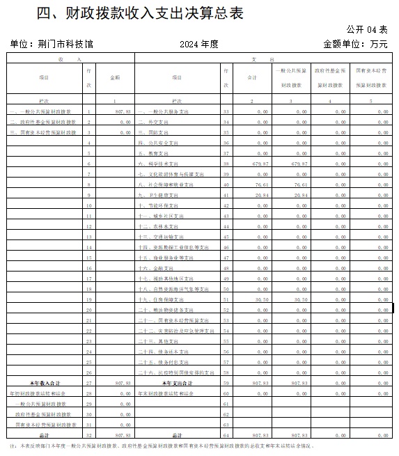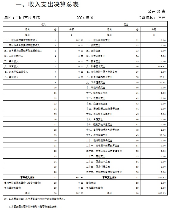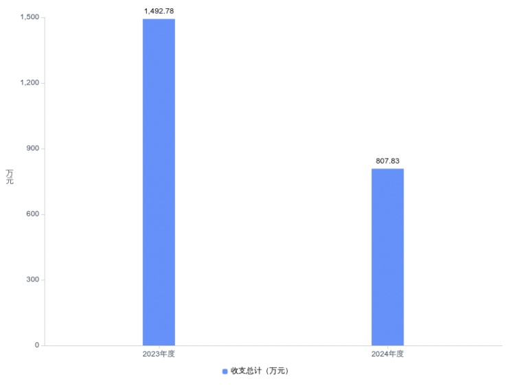 2024年度收、支总计均为807.83万元。与2023年度相比,收、支总计减少684.95万元,下降45.9%,主要原因是青少年科技馆改造项目2023年收支了999.59万元,2024年青少年科技馆改造项目收支了290.42万元,项目支出减少了709.17万元,所以收、支总计减少684.95万元。