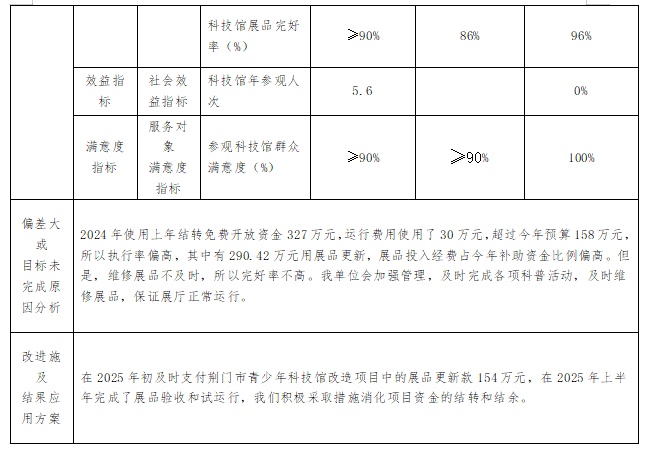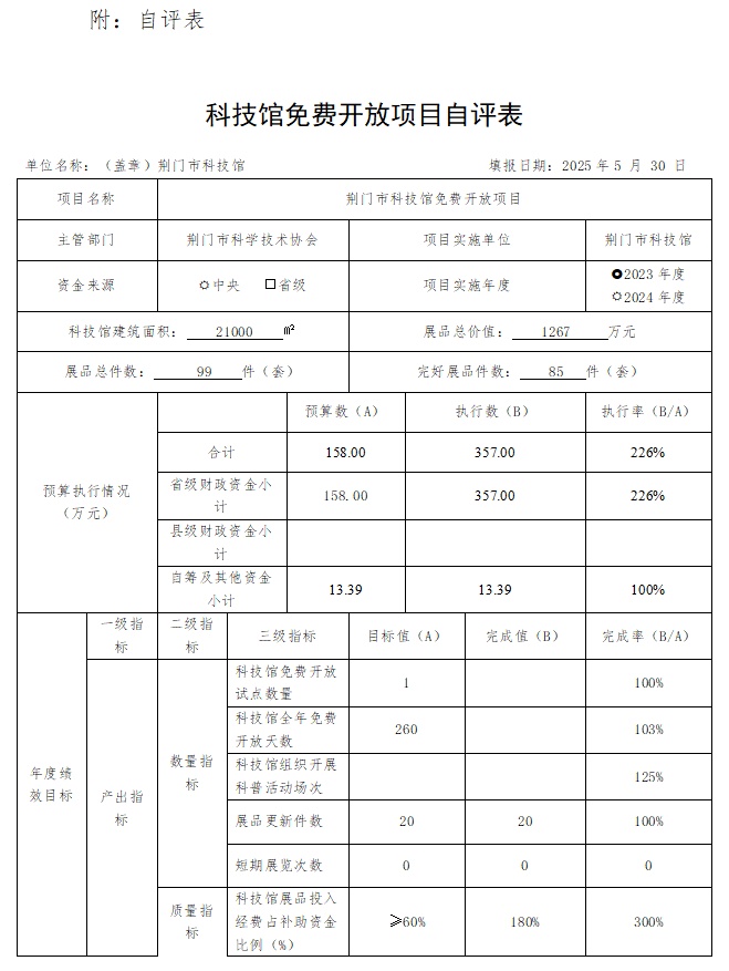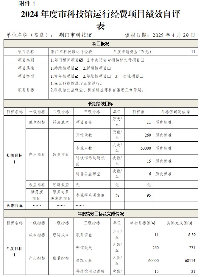 一、2024年度荆门市科技馆整体绩效评价自评表或(报告)